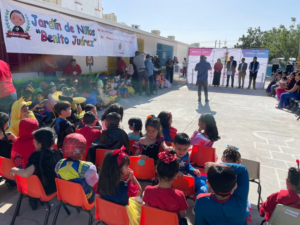 CD. JUAREZ, CHIH.- El Presidente Municipal, Cruz Pérez Cuéllar, entregó esta mañana varias obras de mejora en el Jardín de Niños Benito Juárez, localizado entre las calles Constitución y Carlos Villarreal, el cual es considerado el primer preescolar fundado en esta ciudad, con 93 años de existencia.