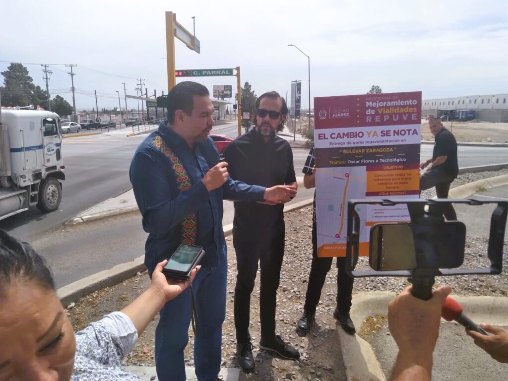 CD. JUAREZ, CHIH.-El Presidente Municipal, Cruz Pérez Cuéllar, estuvo en el bulevar Zaragoza para anunciar a la comunidad que la Dirección General de Obras Públicas concluyó con los trabajos de repavimentación de esta arteria, la cual fue rehabilitada a través del Programa de Mejoramiento de Vialidades con recursos de Registro Público Vehicular (REPUVE).