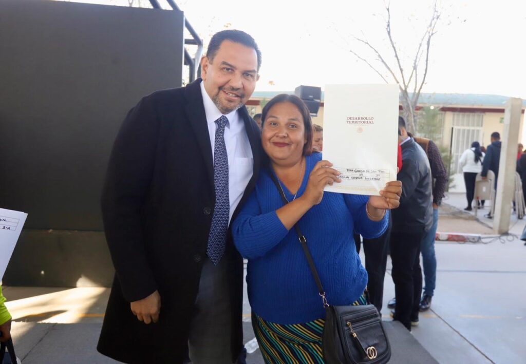 La ceremonia de entrega de los documentos la presidieron el alcalde Cruz Pérez Cuellar; José Alfonso Iracheta Carroll, director general de INSUS; Mónica Palacio García, representante regional de INSUS en el estado de Chihuahua y Julio de la Cruz Reyes, director de Asentamientos Humanos.
