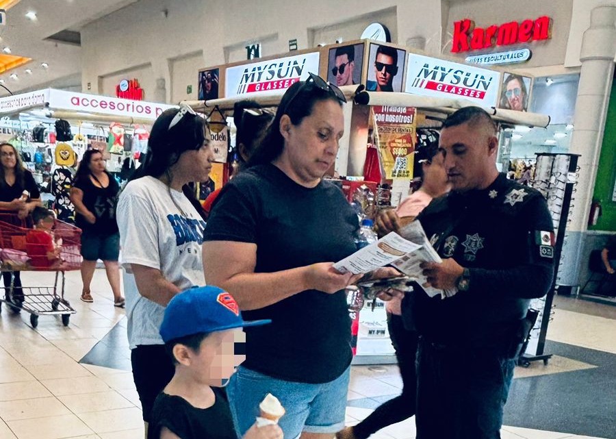 CD. JUAREZ, CHIH.-Elementos municipales adscritos a la Dirección de Prevención Social de la Secretaría de Seguridad Pública Municipal, acudieron varias plazas comerciales con la intención de interactuar con los ciudadanos, para hacerles entrega de volantes con información preventiva.