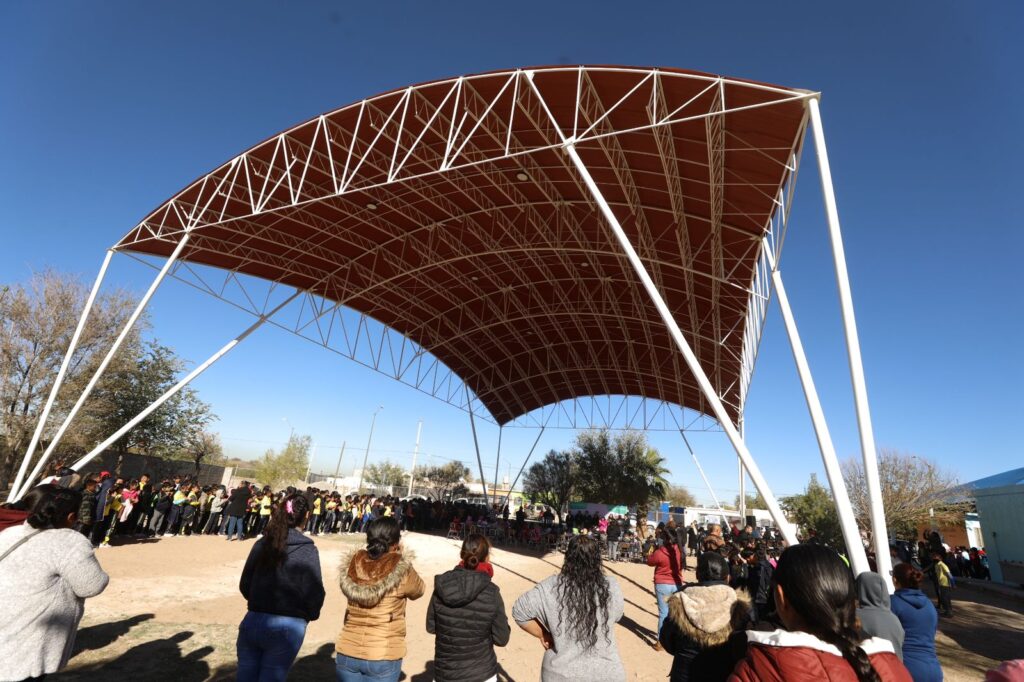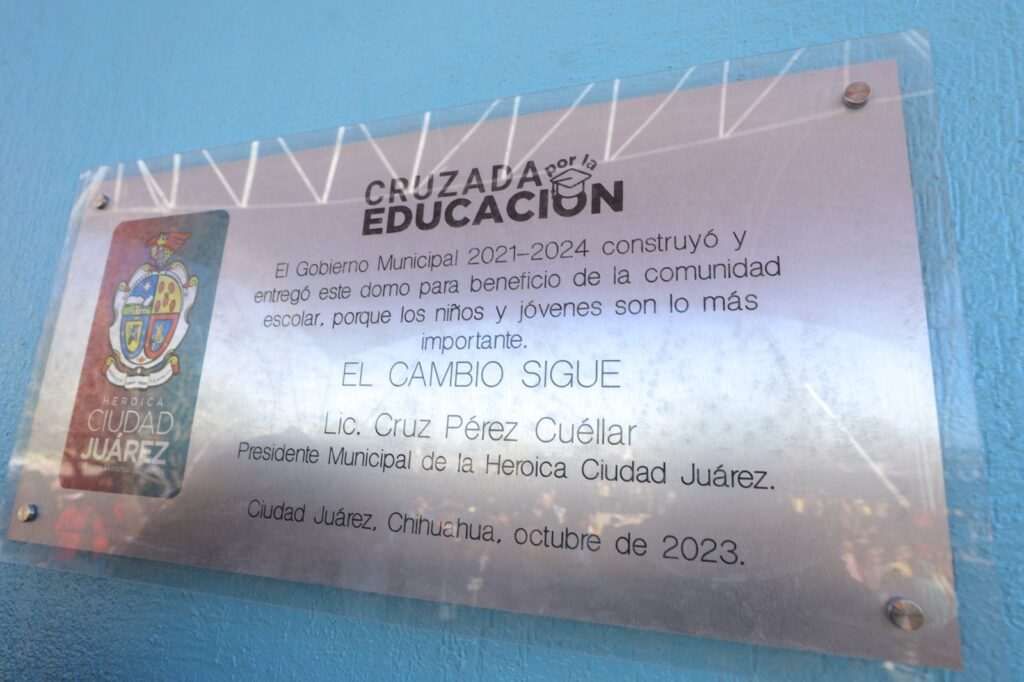 CD. JUAREZ, CHIH.- Acompañado de funcionarios municipales, padres de familia y maestros, el Presidente Municipal, Cruz Pérez Cuéllar, entregó este día domos en las escuelas Un Siglo de Servicio y Luis Ramsés Meneses Hoyos, situadas en el fraccionamiento Riberas del Bravo, etapa 2.