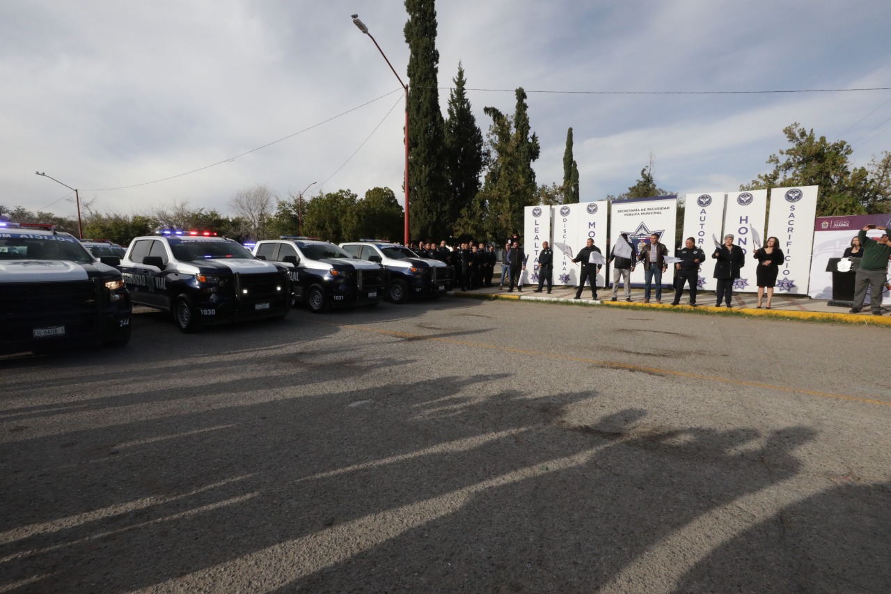 CD. JUAREZ, CHIH.- Como parte de las acciones que se realizan para fortalecer las corporaciones en beneficio de la comunidad, el Presidente Municipal, Cruz Pérez Cuéllar, entregó este día 100 unidades a la Secretaría de Seguridad Pública Municipal (SSPM).