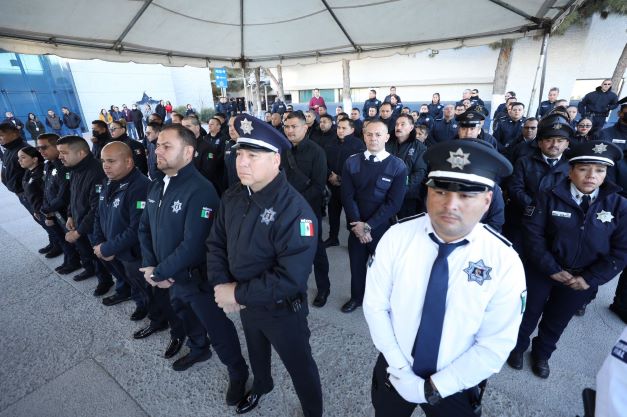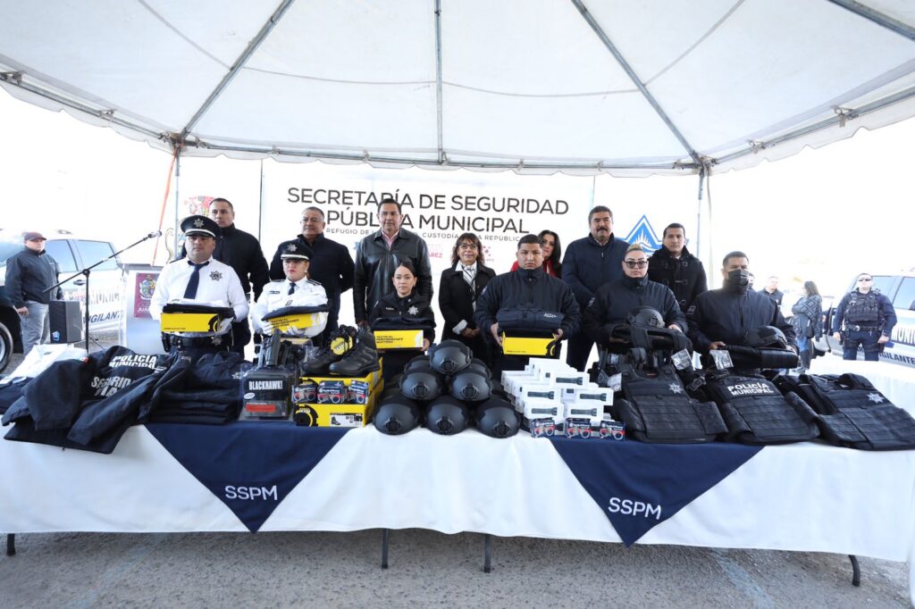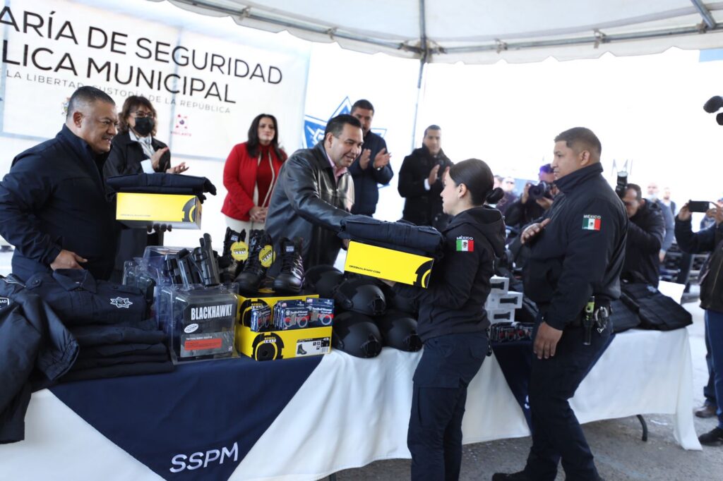 CD. JUAREZ, CHIH.– El Presidente Municipal, Cruz Pérez Cuéllar, encabezó la entrega de uniformes y equipo con un valor de 60 millones de pesos, para los elementos de la Secretaría de Seguridad Pública Municipal (SSPM) y de la Coordinación General de Seguridad Vial (CGSV).