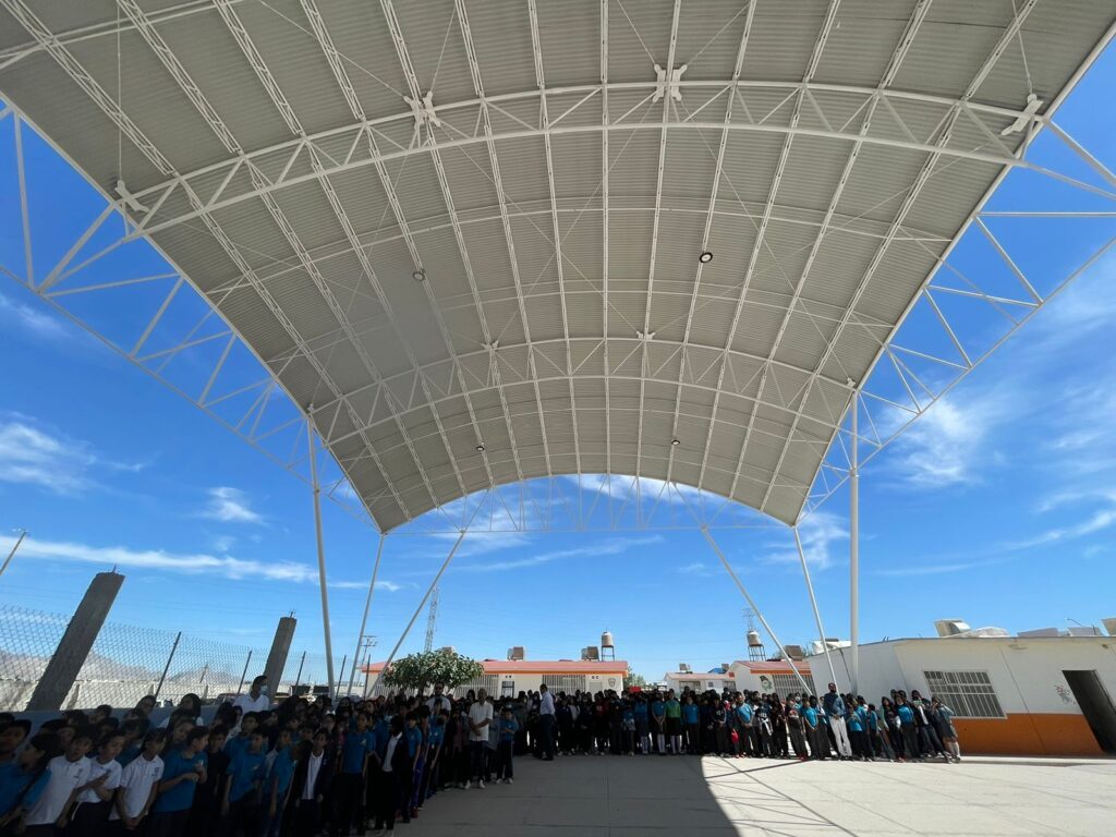 CD. JUAREZ, CHIH.- El Presidente Municipal, Cruz Pérez Cuéllar, estuvo hoy en la Escuela Primaria Manuel Muela Reyes, para llevar a cabo la entrega del domo escolar que construyó la Dirección General de Obras Públicas en este plantel.