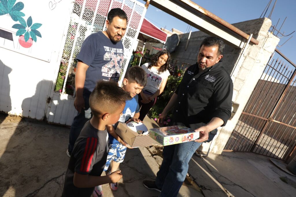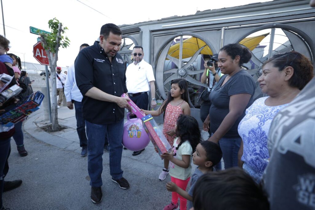 CD. JUAREZ, CHIH.- El Presidente Municipal, Cruz Pérez Cuéllar, acompañado de su esposa y titular del DIF, Rubí Enríquez, encabezó la entrega de juguetes y apoyos alimenticios a las familias de Praderas de los Oasis.