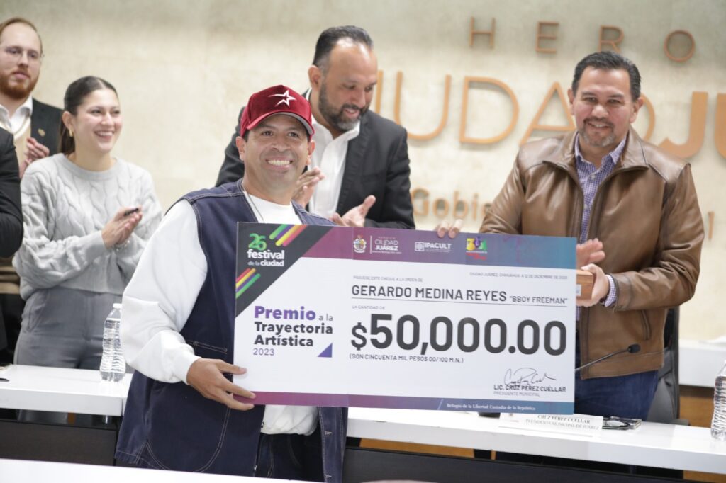 CD. JUAREZ, CHIH.- En Sesión Extraordinaria de Cabildo, el Presidente Municipal, Cruz Pérez Cuéllar, encabezó la entrega del Premio a la Trayectoria Artística 2023 a Gerardo Medina Reyes “Freeman”.