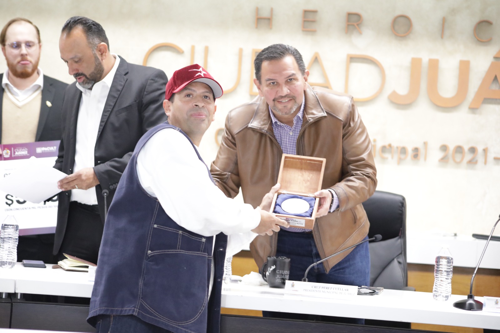 CD. JUAREZ, CHIH.- En Sesión Extraordinaria de Cabildo, el Presidente Municipal, Cruz Pérez Cuéllar, encabezó la entrega del Premio a la Trayectoria Artística 2023 a Gerardo Medina Reyes “Freeman”.