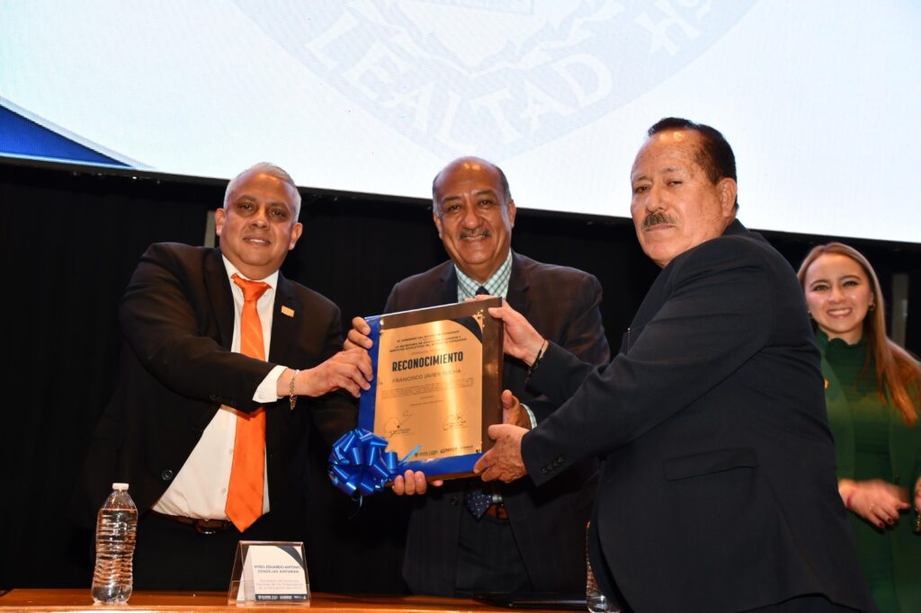 Durante la ceremonia las autoridades también entregaron placas a los docentes con la mayor antigüedad, como es Francisco Javier Rocha, maestro activo de la Normal Superior “Profr. José E. Medrano R.”, con 43 años de servicio ininterrumpido.