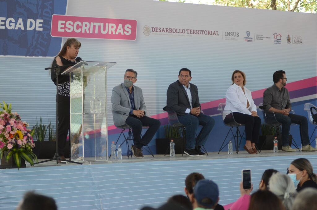CD. JUAREZ, CHIH.- Derivado del convenio que firmó el Gobierno Municipal con el Instituto Nacional del Suelo Sustentable (INSUS), 750 familias en condición vulnerable recibieron los títulos de propiedad que dan certeza jurídica a su patrimonio, documentos que fueron entregados por el Presidente Municipal, Cruz Pérez Cuéllar y la Gobernadora María Eugenia Campos Galván.