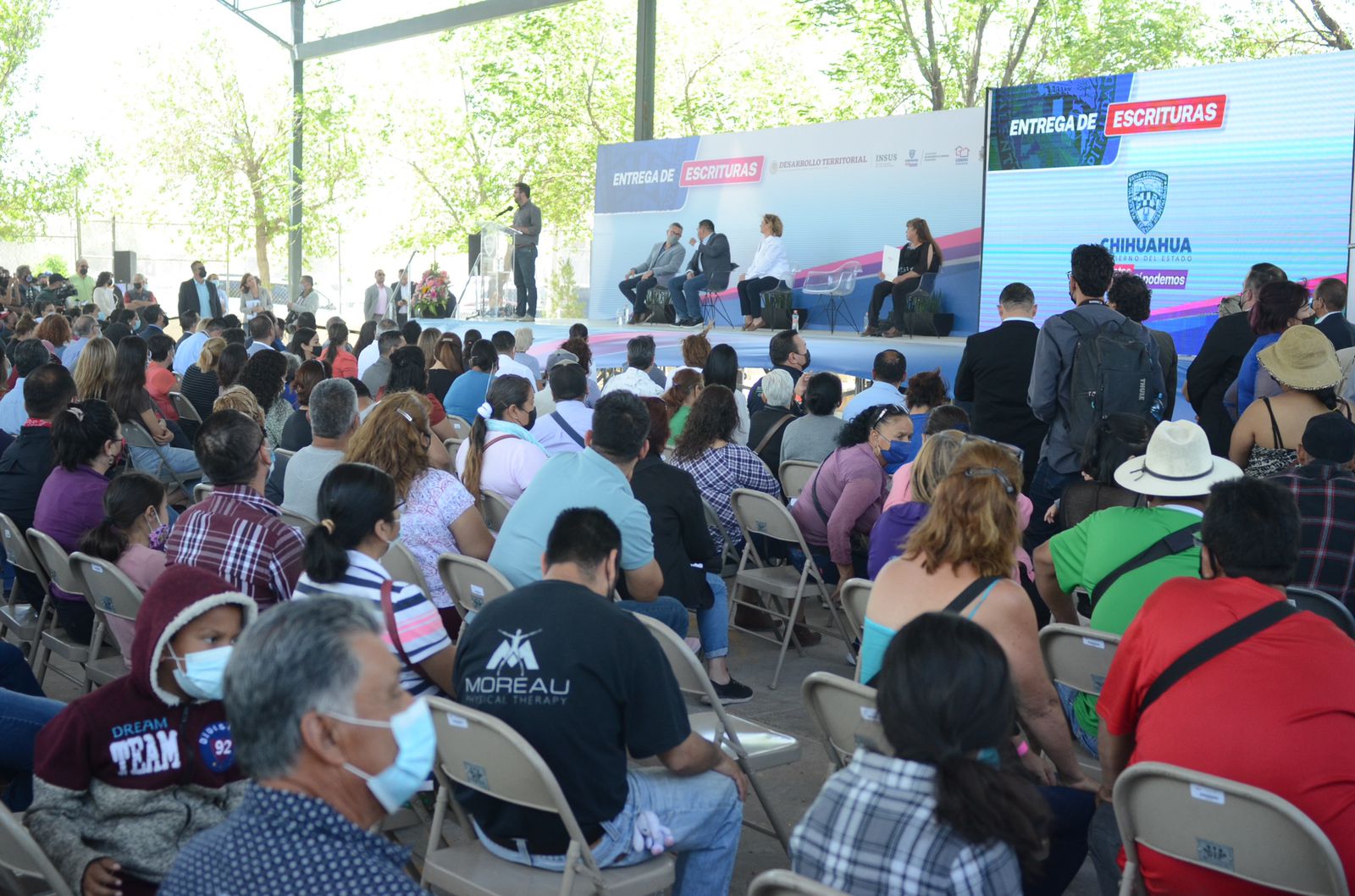 CD. JUAREZ, CHIH.- Derivado del convenio que firmó el Gobierno Municipal con el Instituto Nacional del Suelo Sustentable (INSUS), 750 familias en condición vulnerable recibieron los títulos de propiedad que dan certeza jurídica a su patrimonio, documentos que fueron entregados por el Presidente Municipal, Cruz Pérez Cuéllar y la Gobernadora María Eugenia Campos Galván.
