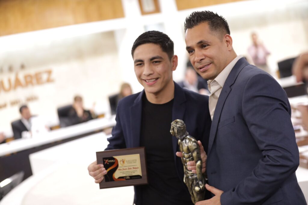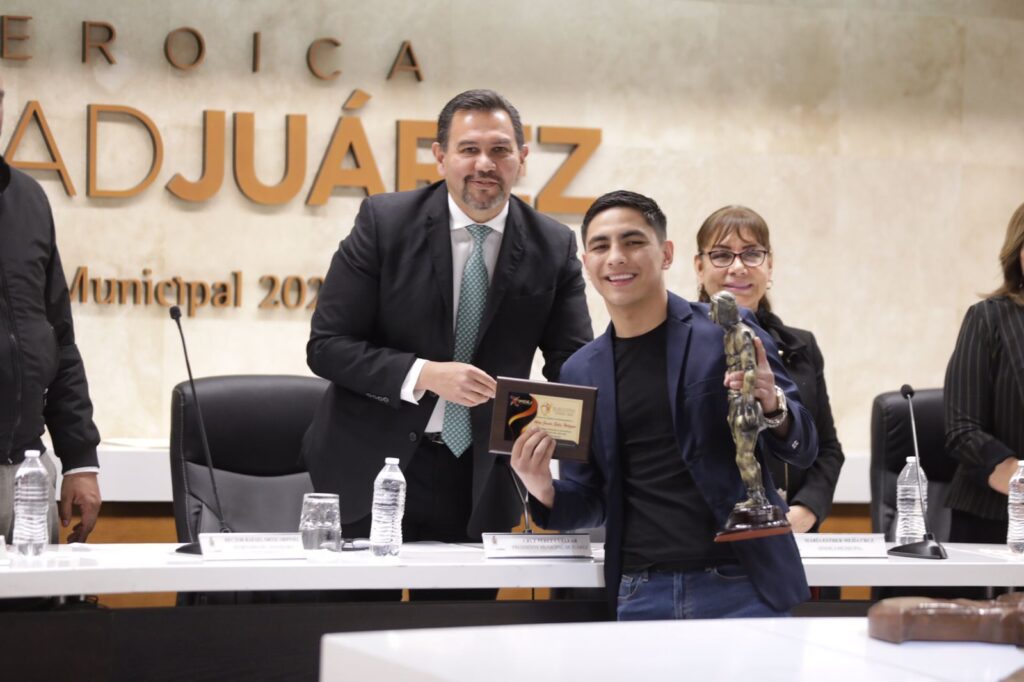 CD. JUAREZ, CHIH.- Los deportistas juarenses que destacaron durante el año pasado, recibieron este día un reconocimiento en sesión solemne de Cabildo; uno de los homenajeados fue Alan ”Cachorro” Solís, Deportista del año 2022, a quien se le entregó la estatuilla Agustín “Cheche” Álvarez por parte del Presidente Municipal, Cruz Pérez Cuéllar.