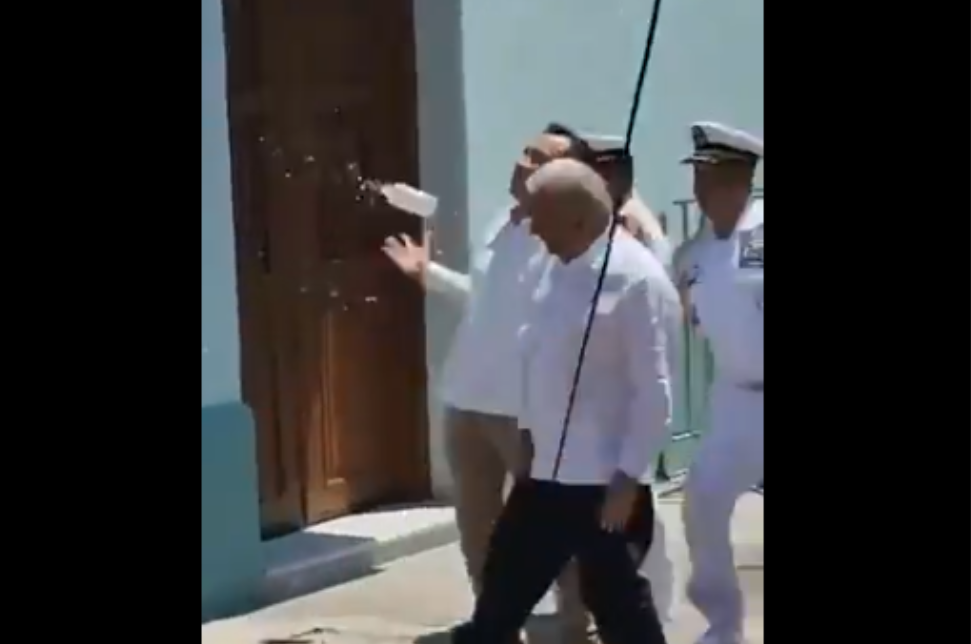 VERACRUZ, MEXICO.- El presidente Andrés Manuel López Obrador, se salvó de un botellazo de agua que le lanzó uno de los trabajadores del Poder Judicial que se manifestaron a unos metros del Centro Cultural “Leyes de Reforma” que fue inaugurado por el primer mandatario en Veracruz.