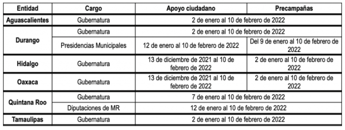 CIUDAD DE MEXICO.- El Instituto Nacional Electoral (INE) ha definido con claridad las reglas para la contabilidad, rendición de cuentas y fiscalización de las actividades para la obtención del apoyo de la ciudadanía por parte de aspirantes a una candidatura independiente, así como de las precampañas que implementen los partidos políticos para los procesos electorales locales 2021-2022 en los estados de Aguascalientes, Durango, Hidalgo, Oaxaca, Quintana Roo y Tamaulipas que se celebran conforme al siguiente.