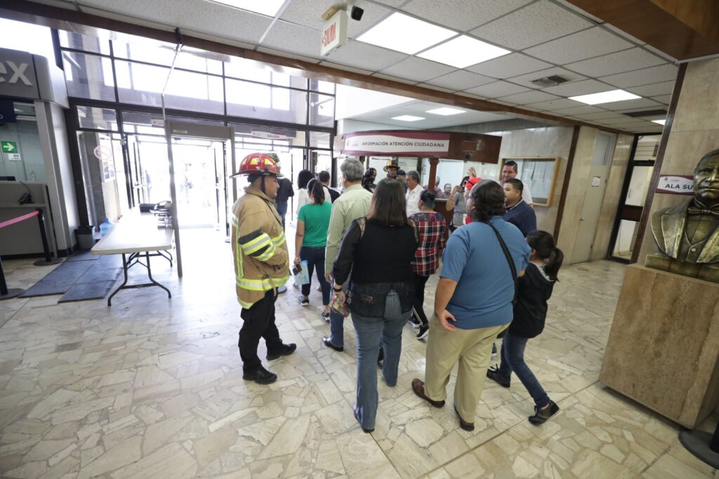 Mencionó que las personas fueron concentradas en tres puntos, ya que además de la salida principal, se tienen otras dos en las alas sur y norte del edificio.