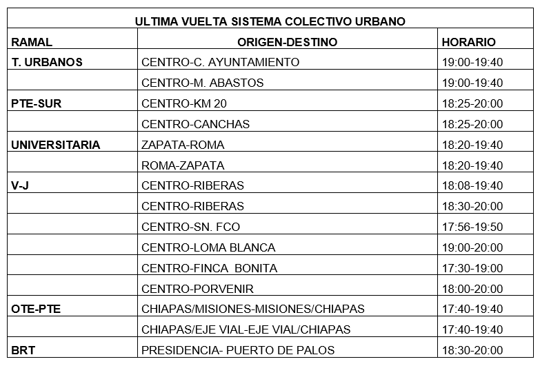 En relación a la BRT principia a las 4:30 am y la ruta Valle de Juárez-Riveras a las 4:00 am, estas dos líneas con 3 vueltas y media.