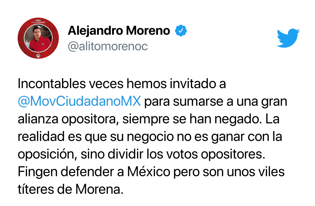A través de un mensaje en sus redes sociales, el líder nacional del tricolor subrayó que “incontables veces hemos invitado a Movimiento Ciudadano para sumarse a una gran alianza opositora”, pero “siempre se han negado”.