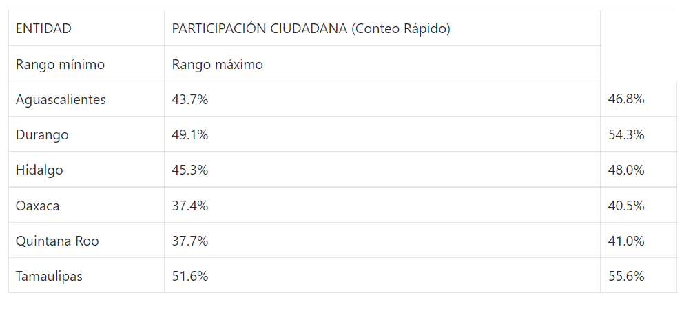 CIUDAD DE MEXICO.- Este domingo, más de 11.7 millones de mexicanas y mexicanos de los estados de Aguascalientes, Durango, Hidalgo, Oaxaca, Quintana Roo y Tamaulipas, fueron convocados a votar en cerca de 21 mil casillas para renovar sus gubernaturas, así como 25 diputaciones del Congreso local en Quintana Roo y 39 ayuntamientos en Durango.