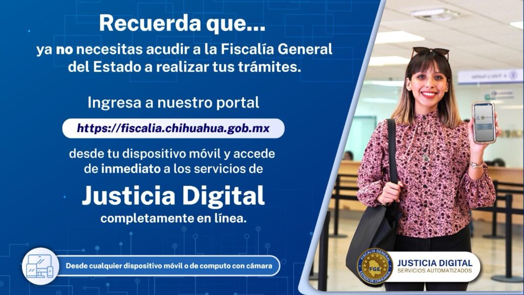 “Justicia Digital” es una plataforma que ofrece la Fiscalía General del Estado para realizar cualquier trámite ya sea solicitar constancia de antecedentes penales, de extravío de documentos, además también se ofrece la modalidad de video denuncia, así como denuncia empresarial y denuncia anónima, todo a través del portal https://fiscalia.chihuahua.gob.mx/justicia-digital.