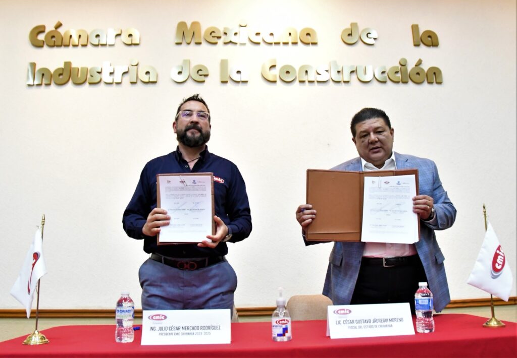 El convenio fue firmado esta mañana por el Fiscal General del Estado, César Jáuregui Moreno y el presidente de CMIC Chihuahua, Julio César Mercado Rodríguez, ante un nutrido grupo de constructores.