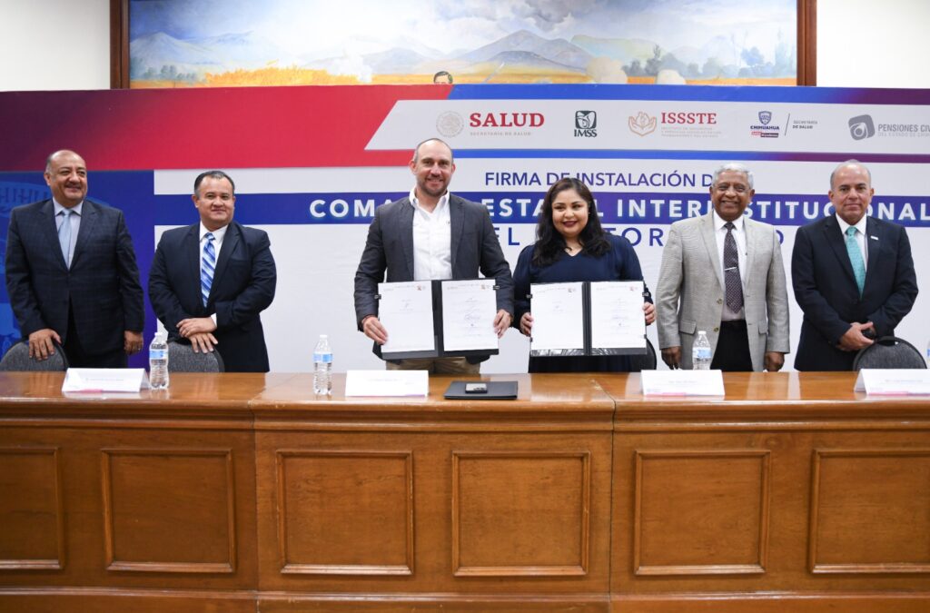 CHIHUAHUA.- En un evento realizado en el Salón Sacramento de Palacio de Gobierno, representantes de diversas instituciones de salud tanto de nivel federal como estatal, llevaron a cabo la firma del acuerdo para la instalación del Comando Interinstitucional del Sector de Salud.