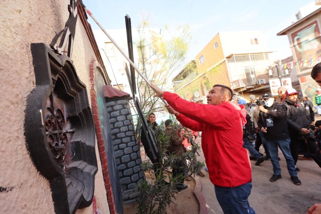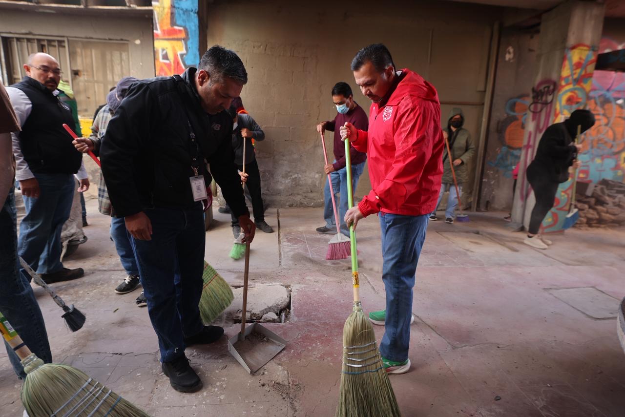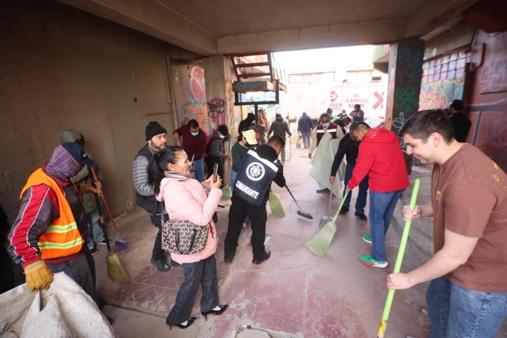 CD. JUAREZ, CHIH.- Como parte de las acciones para fortalecer el tejido social y mejorar el entorno urbano, el Gobierno Municipal de Ciudad Juárez, encabezado por el Presidente Municipal, Cruz Pérez Cuéllar, llevó a cabo una jornada del programa “Juárez Amanece Limpio” en la Plaza Cervantina, con la participación de ciudadanía, colectivos culturales y el FC Juárez.