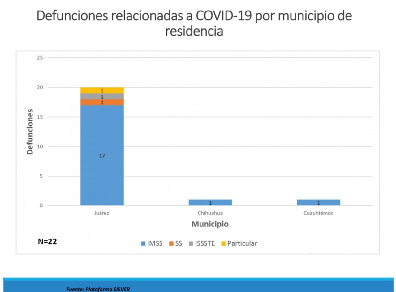 En la conferencia de prensa virtual que se ofrece diariamente por parte del Gobierno del Estado para dar a conocer el comportamiento de la enfermedad en la entidad, el director médico de la Secretaría de Salud en la Zona Norte, Arturo Valenzuela Zorrilla, informó que de las 22 personas fallecidas, 20 decesos corresponden a Ciudad Juárez, uno a la ciudad de Chihuahua y uno a Cuauhtémoc.