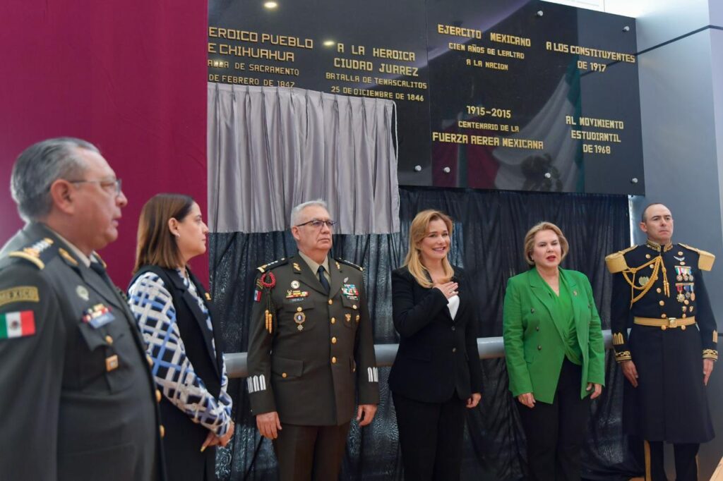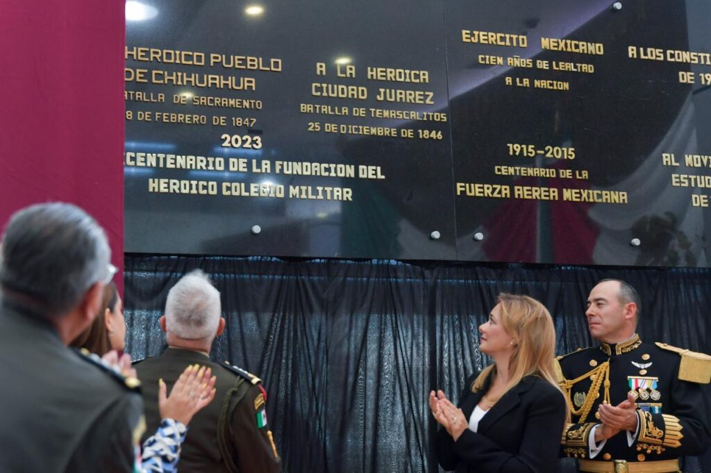 CD. JUAREZ, CHIH.- La gobernadora Maru Campos acudió a la develación de la placa en letras doradas en conmemoración del 200 aniversario de la fundación del Heroico Colegio Militar, mismas que fueron instaladas en los Muros de Honor del Congreso del Estado.