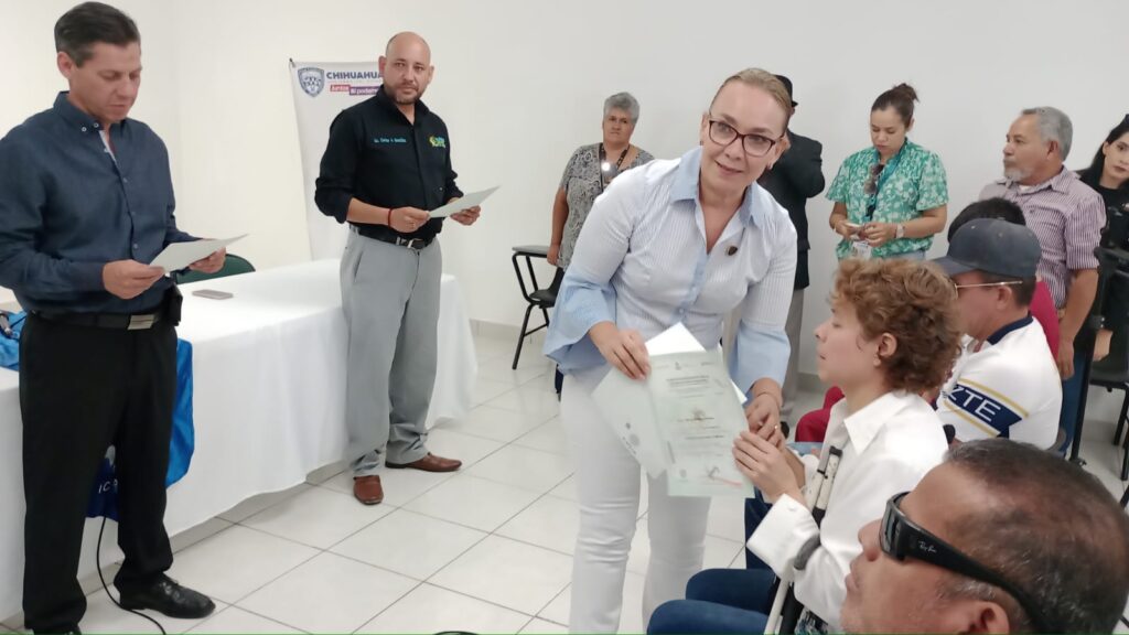 CD. JUAREZ, CHIH.- En el edificio principal de Desarrollo Humano y Bien Común, en el Parque Central, se llevó a cabo la entrega de reconocimientos en masoterapia para aquellas personas que tomaron la capacitación y padecen alguna discapacidad visual, donde se contó con la presencia de Sergio Acosta Liceaga, Subsecretario de Desarrollo Humano y Bien Común Zona Norte y Luz Herminia Gómez, Coordinadora de Icatech zona norte.