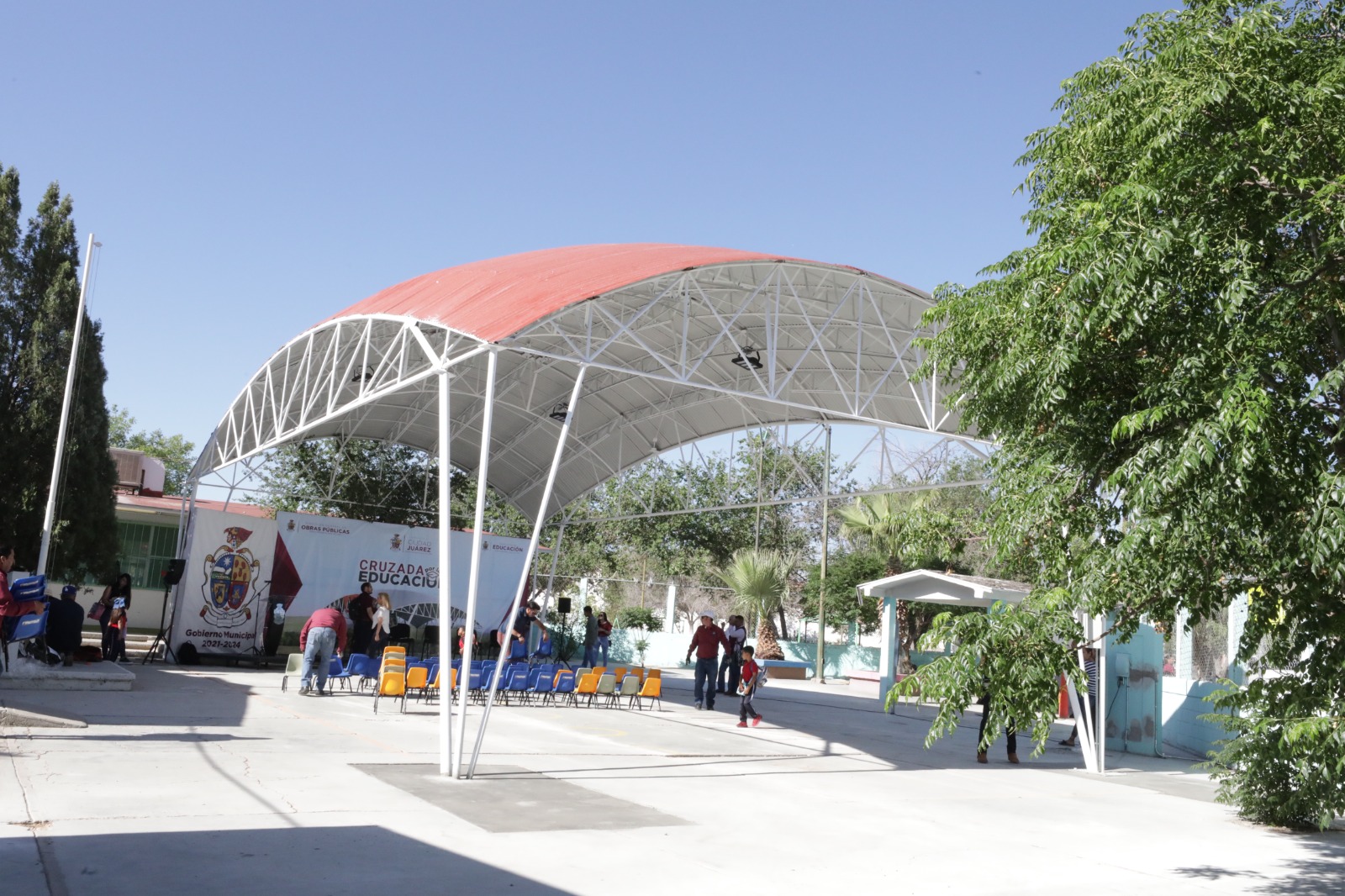 CD. JUAREZ, CHIH.- Los niños del Jardín de niños Primavera, ubicado en la colonia Morelos agradecieron al Presidente Municipal, Cruz Pérez Cuéllar, por la instalación de un domo que ahora les permitirá realizar actividades deportivas y culturales al exterior de las aulas.