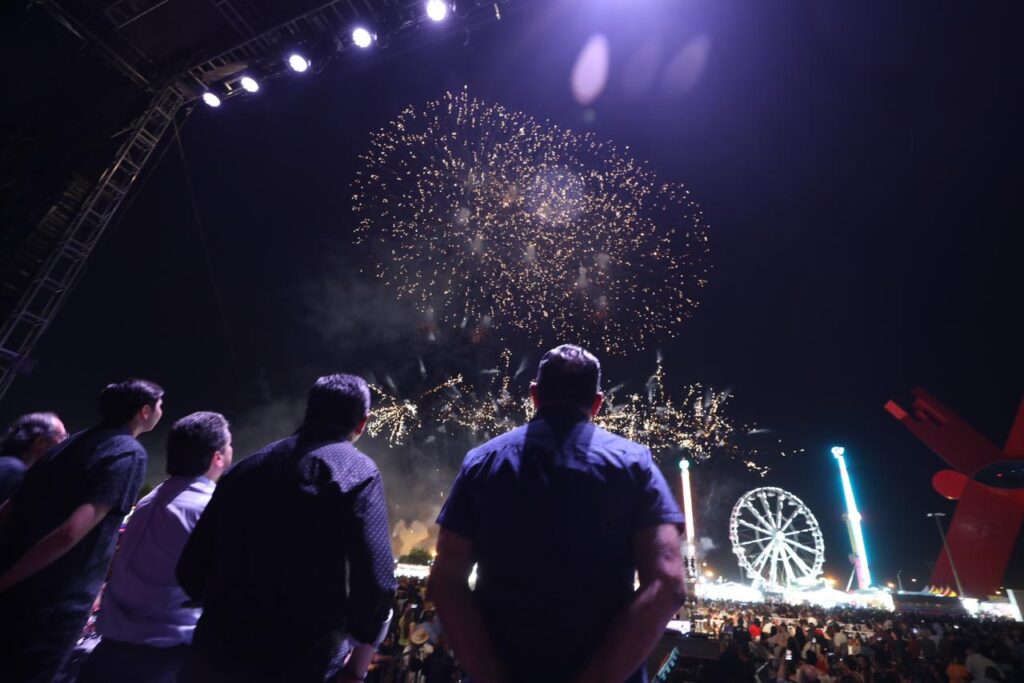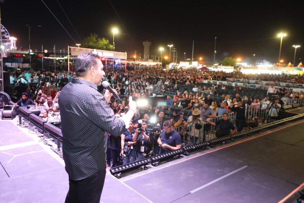 CD. JUAREZ, CHIH.-Anoche, el Presidente Municipal, Cruz Pérez Cuéllar, estuvo junto a miles de fronterizos en la Plaza de la Mexicanidad para dar inicio a los festejos de la Feria Juárez 2023, con el concierto del grupo musical Matute.