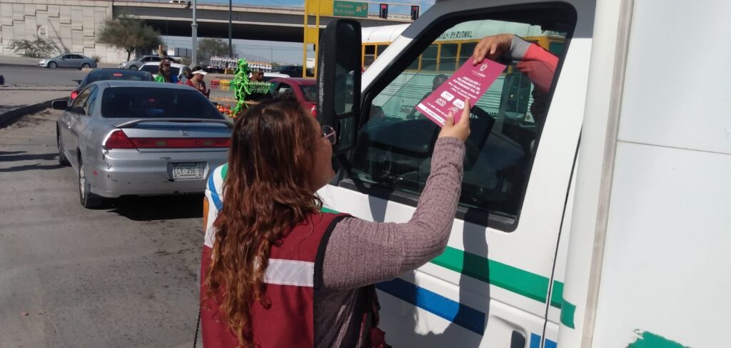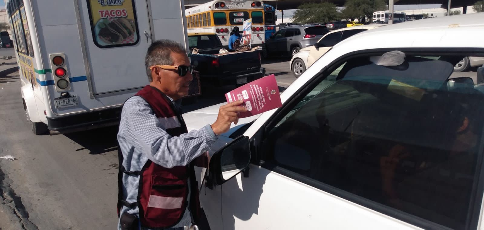 CD. JUAREZ, CHIH.- Con el fin de socializar las obras que se llevarán a cabo con la construcción del distribuidor vial Talamás Camandari, personal de la Dirección General de Desarrollo Social, entregó volantes a los ciudadanos sobre las adecuaciones en el puente y las alternativas de circulación.