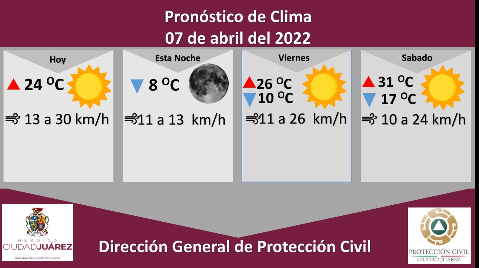 CD. JUAREZ, CHIH.-La Dirección de Protección Civil municipal, con base en informes del Sistema Meteorológico Nacional, pronostica un día soleado con una temperatura máxima de 24 grados Celsius, además ingresa a la región el frente frío número 41, lo cual provocará un descenso en la temperatura.
