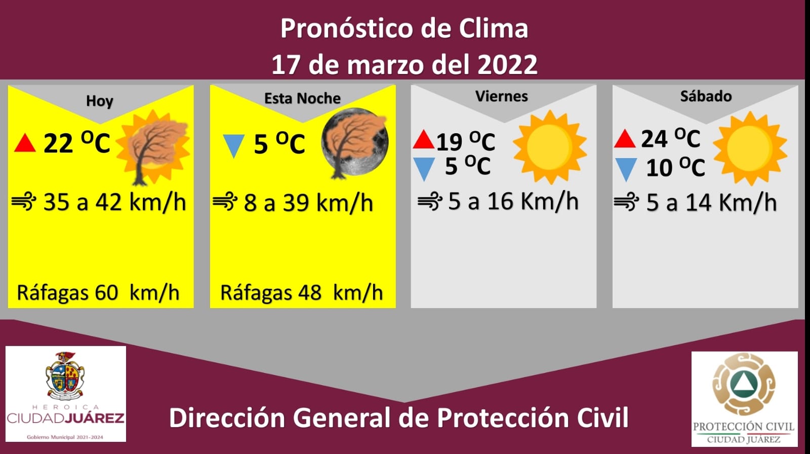 CD. JUAREZ, CHIH.- La Dirección de Protección Civil municipal, con base en informes del Sistema Meteorológico Nacional, emite una alerta amarilla para este jueves, ya que se esperan ráfagas de viento que alcanzarán los 60 kilómetros por hora.