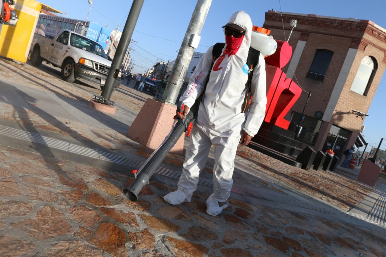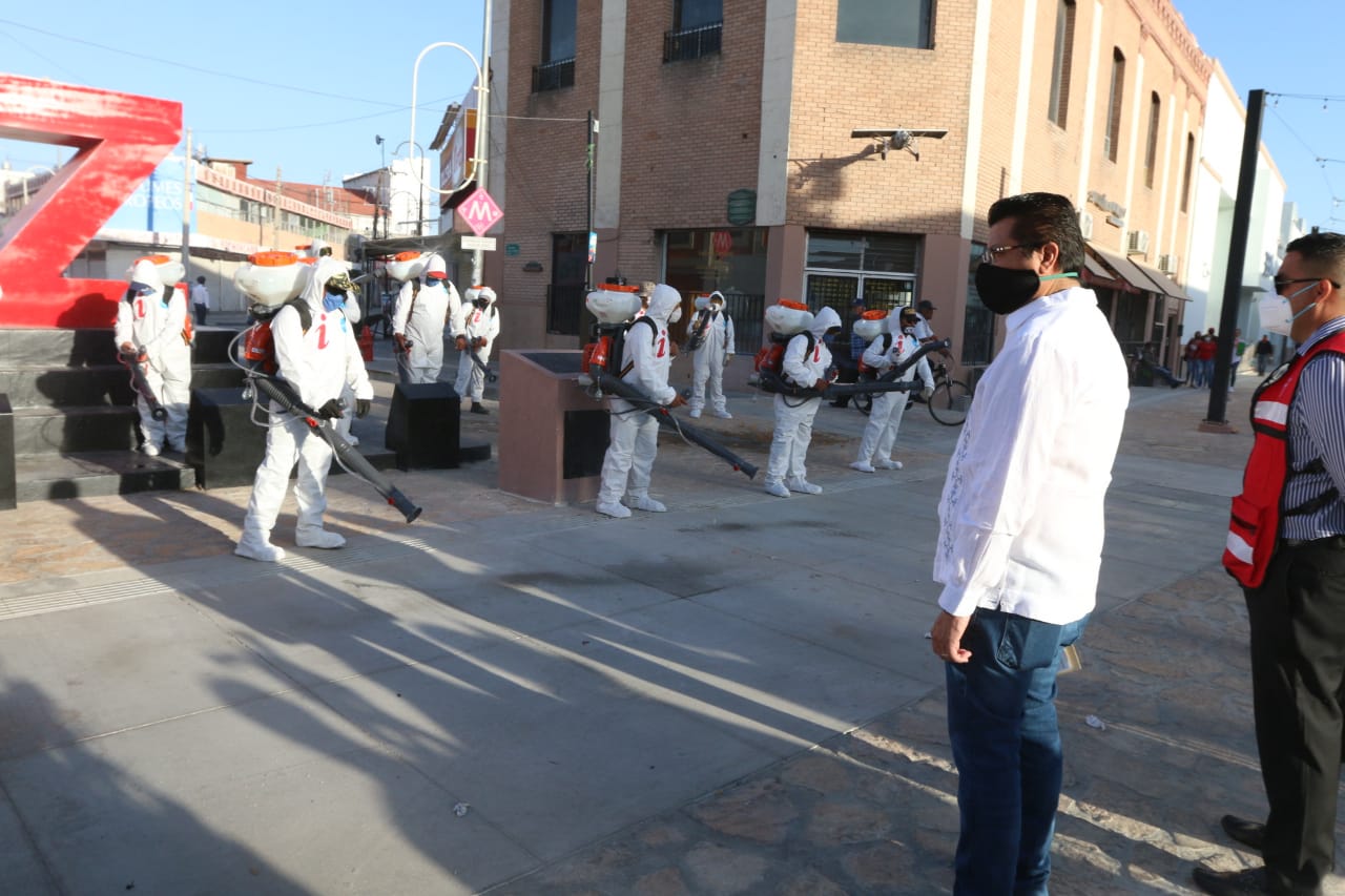 CD. JUÁREZ, CHIH.- Como una de las medidas adoptadas por el Gobierno Municipal para atender la contingencia por el virus Covid-19, esta mañana el Alcalde Armando Cabada Alvídrez dio inicio con la segunda etapa del Programa de Sanitización Urbana en el Centro Historico de la ciudad.