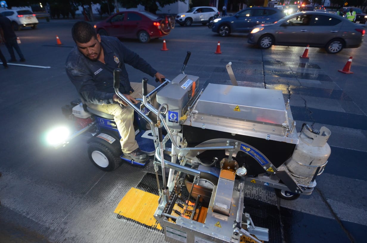CD. JUAREZ, CHIH.-La Coordinación General de Seguridad Vial, a través de personal de Control de Tráfico, y tras el banderazo de obra del Presidente Municipal, Cruz Pérez Cuellar, dio inicio a los trabajos de aplicación de pintura termoplástica en el cruce de las calles Adolfo López Mateos y Paseo Triunfo de la Republica.