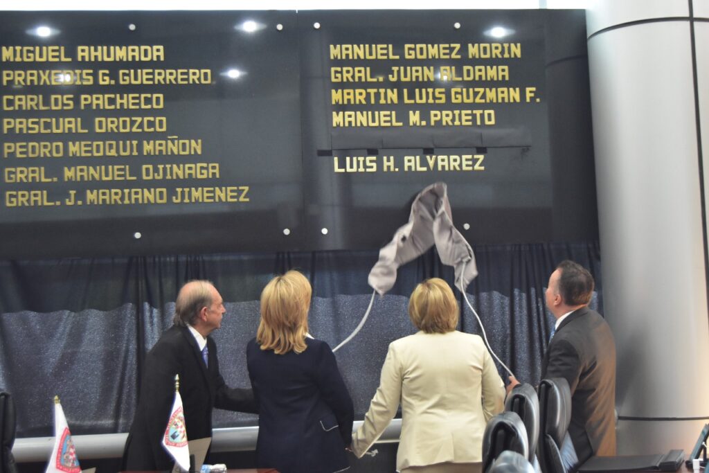 “Inauguramos el grabado del nombre de Don Luis H. Álvarez, el día de hoy queda su nombre escrito con oro, pero desde hace tiempo su nombre quedó marcado también con tinta indeleble en la historia de Chihuahua y de México”, destacó tras la develación del Muro de Honor del Legislativo.
