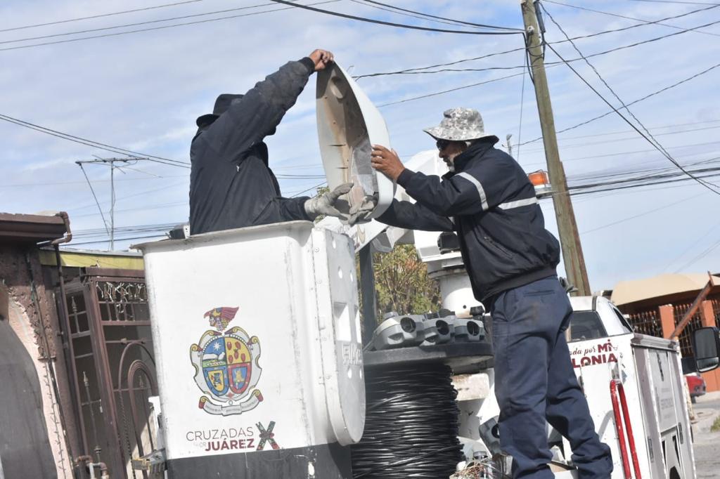 CD. JUAREZ, CHIH.- Personal de la Dirección de Alumbrado Público realizó trabajos en la infraestructura del alumbrado público en el fraccionamiento Prados del Real, con la finalidad de iluminarlo en su totalidad con lámparas de mayor eficacia.