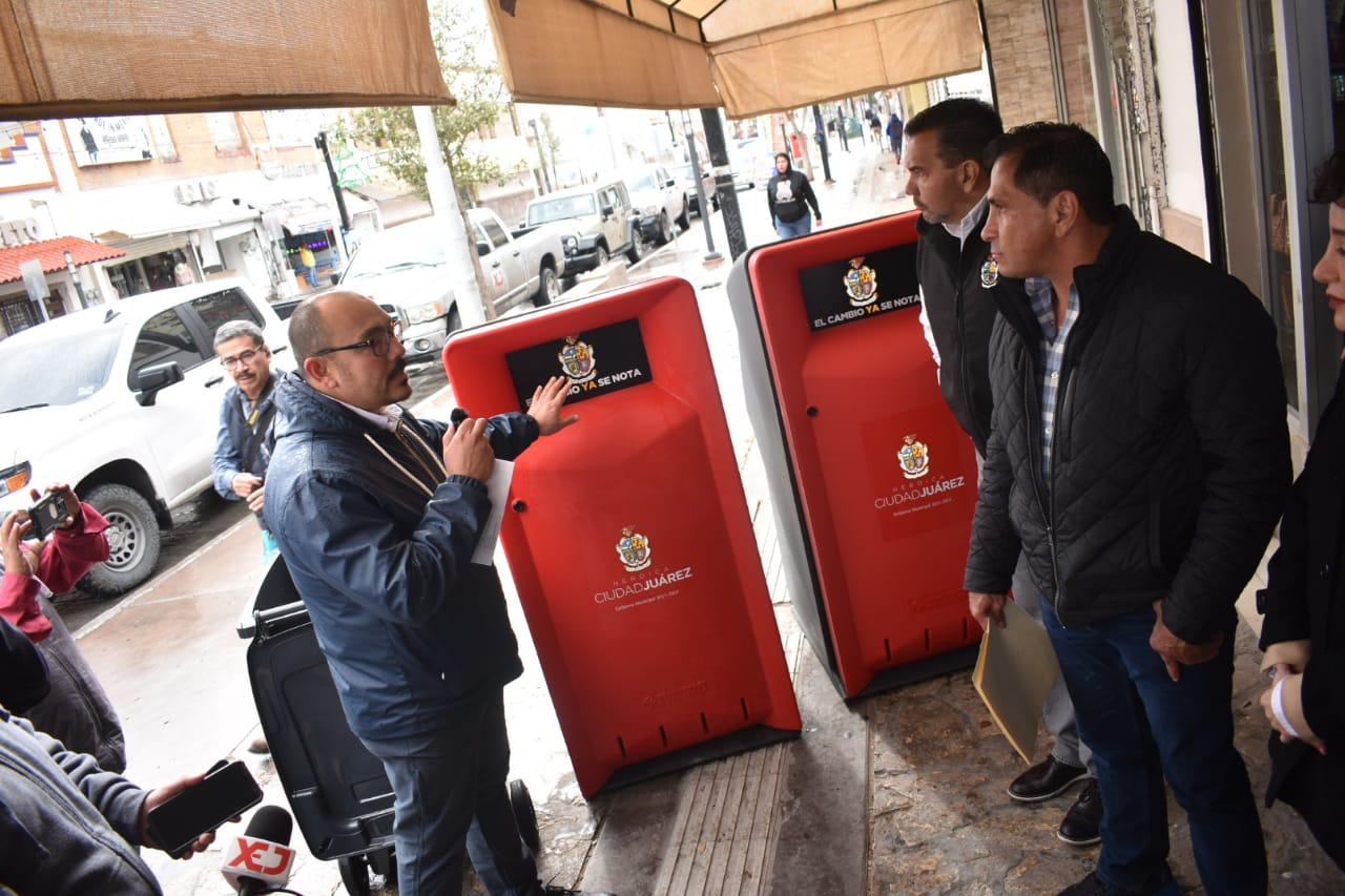 CD. JUAREZ. CHIH.- Con el objetivo de tener un Centro Histórico más limpio, ordenado y moderno, el Gobierno Municipal empezó con la instalación de 100 nuevos colectores de basura en esta parte de la ciudad.