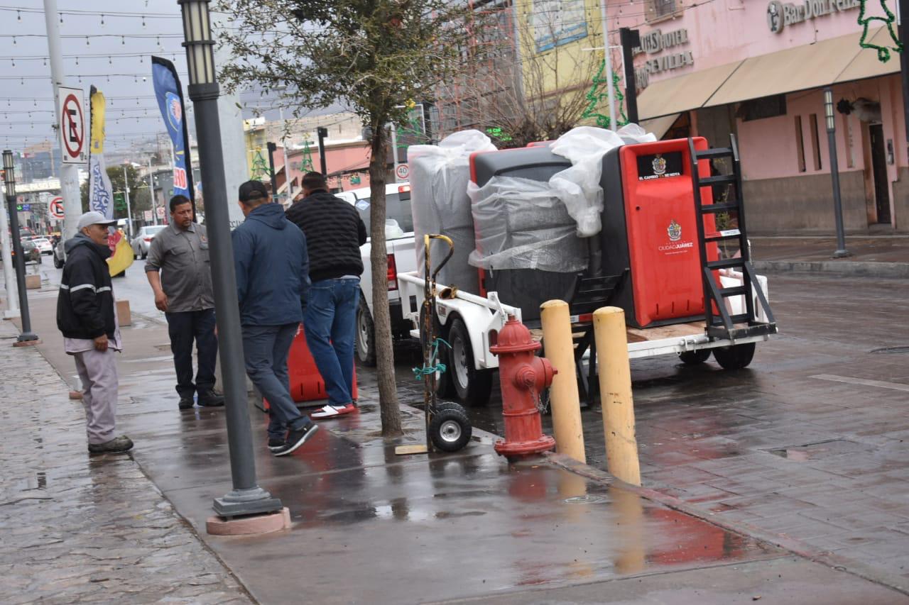 Esta labor, encabezada por el Presidente Municipal, Cruz Pérez Cuéllar arrancó en la avenida Juárez, a unas cuadras del puente internacional Paso del Norte, donde el alcalde dijo que se la colocación de estos contenedores continuará durante las siguientes dos semanas.