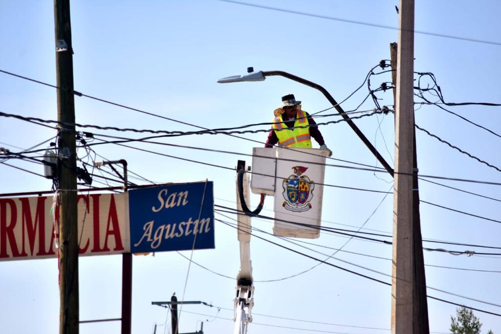 CD. JUAREZ, CHIH.- Personal de la Dirección de Alumbrado Público trabaja en la instalación de más de 320 luminarias led en el ejido de San Agustín, como parte de la implementación de nueva tecnología para mejorar las condiciones de iluminación en los poblados del Valle de Juárez.