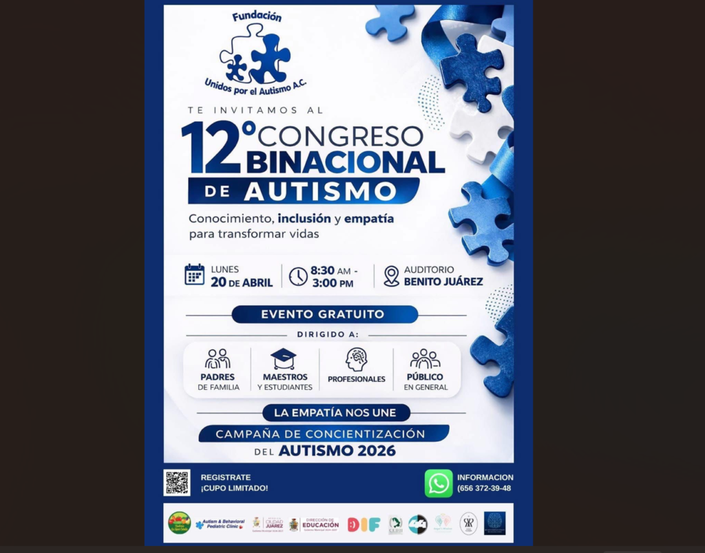 CD. JUAREZ, CHIH.- Con el objetivo de fortalecer la inclusión y generar conciencia sobre el trastorno del espectro autista, se llevará a cabo el XII Congreso Binacional de Autismo.