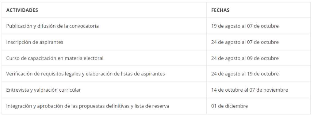 La recepción de la solicitud y documentos correspondientes de la ciudadanía interesada en participar en el proceso de selección será en el periodo comprendido del 24 de agosto al 07 de octubre de 2023.