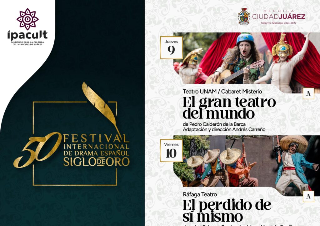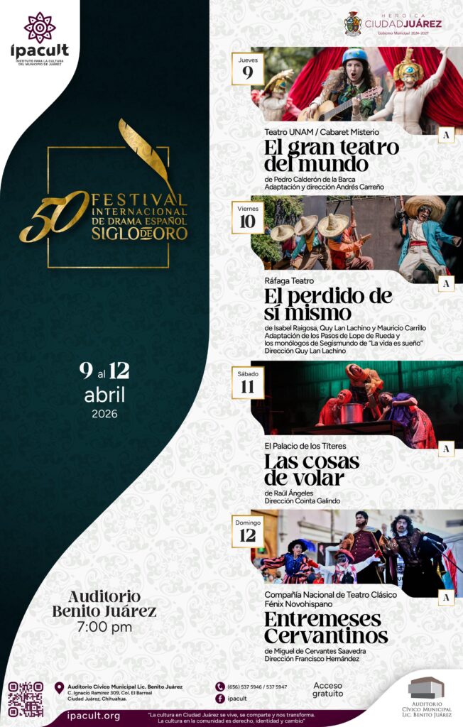 CD. JUAREZ, CHIH.-El Instituto para la Cultura del Municipio de Juárez invita a la comunidad a disfrutar del 50 Festival Internacional de Drama Español del Siglo de Oro, que se llevará a cabo del 9 al 12 de abril de 2026 en el Auditorio Cívico Municipal Lic. Benito Juárez.