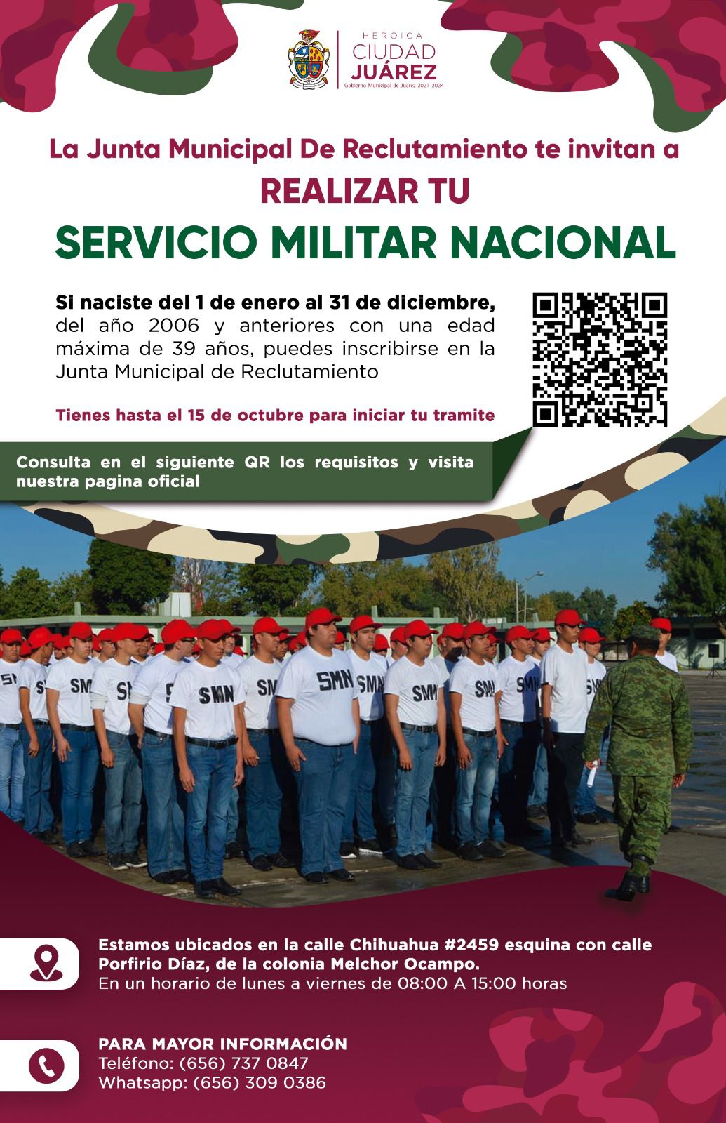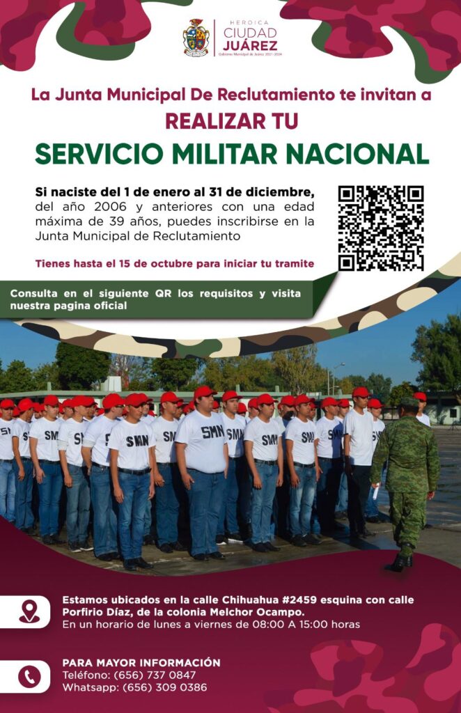 CD. JUAREZ, CHIH.- La Junta Municipal de Reclutamiento invita a los juarenses que nacieron en el año 2006, anticipados y remisos con una edad máxima de 39 años, para que se inscriban y cumplan con el Servicio Militar Nacional.