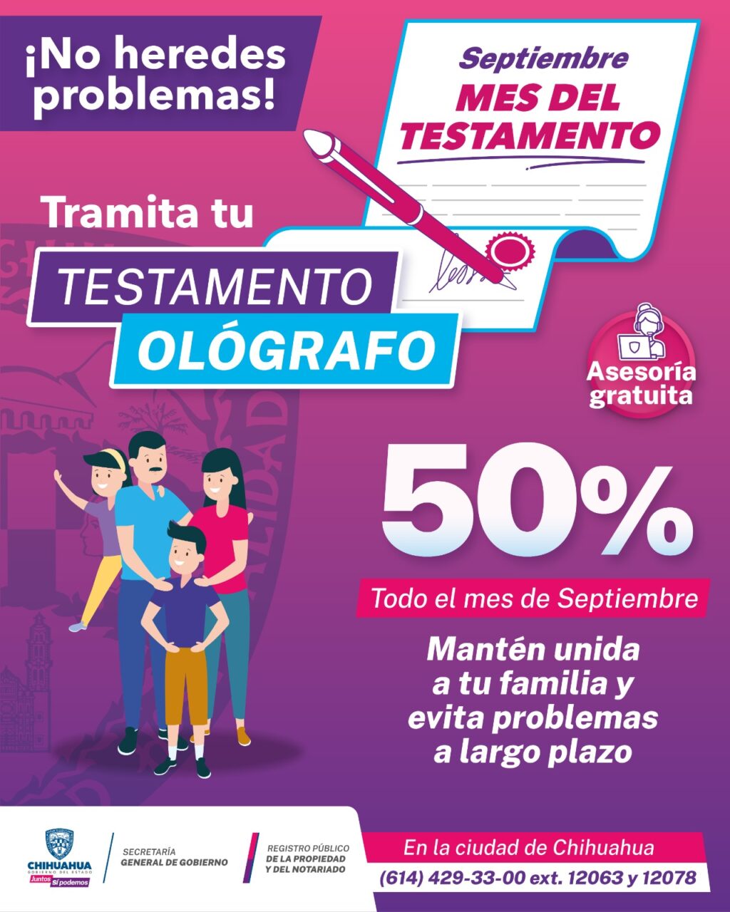 CD. JUAREZ, CHIH.- La Secretaría General de Gobierno, a través del Registro Público de la Propiedad, invita a las y los chihuahuenses a aprovechar los últimos días del Mes del Testamento para tramitar este documento ológrafo, o bien, realizar el pago del mismo y agendar la cita para los próximos meses.