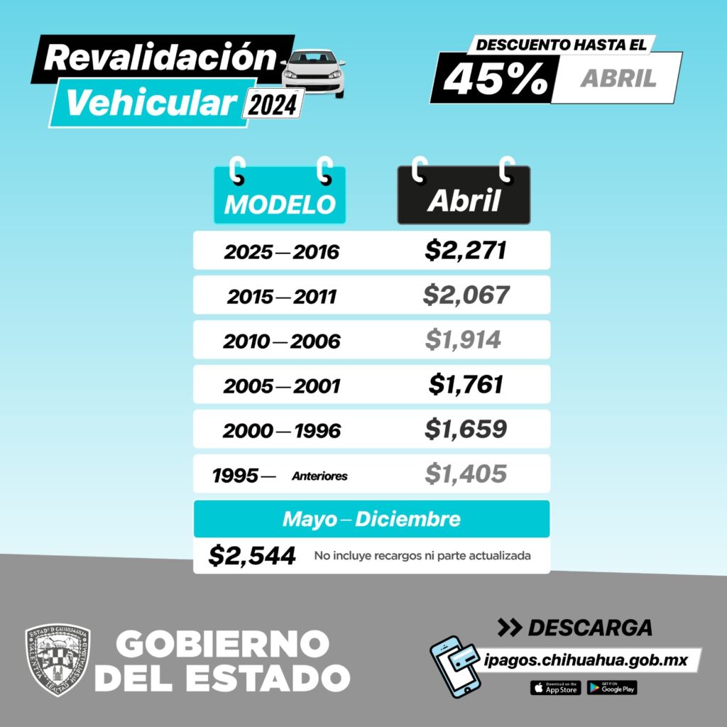 CHIHUAHUA.- La Secretaría de Hacienda invita a las y los contribuyentes, a que aprovechen el último mes de descuentos del programa de Revalidación Vehicular 2024, mismos que durante abril alcanzan hasta un 45 por ciento de reducción en el pago.