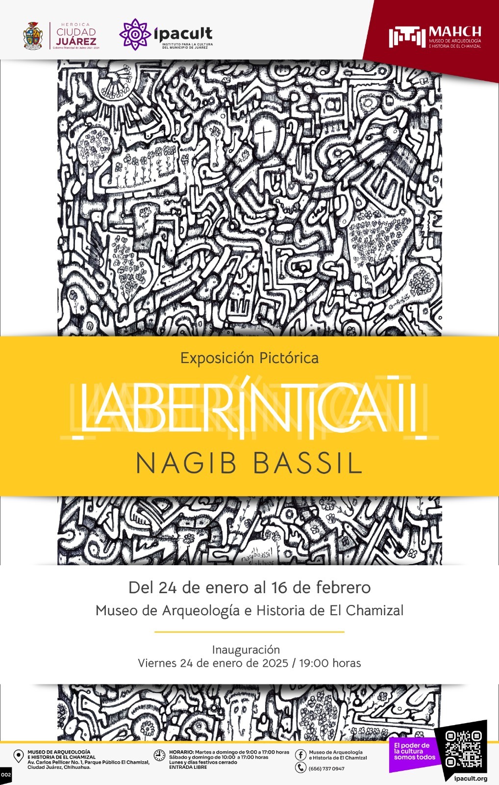 CD. JUAREZ, CHIH.- El Instituto para la Cultura del Municipio de Juárez (IPACULT) invita al público en general a la inauguración de la exposición pictórica “Laberíntica II”, una colección del artista Nagib Bassil, que se presentará en el Museo de Arqueología e Historia de El Chamizal (MAHCH).