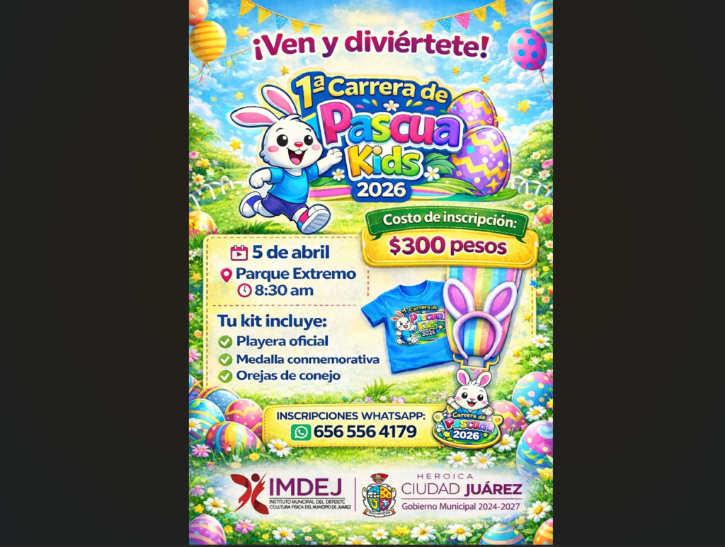 CD. JUAREZ, CHIH.- Como parte de las actividades de la Semana Santa, el Instituto Municipal del Deporte y Cultura Física de Juárez (IMDEJ), invitó a la población en general a participar en la Primera Carrera Pascua Kids 2026.