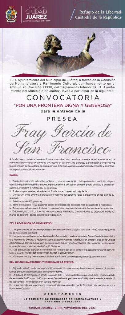 CD. JUAREZ, CHIH.- Con el fin de reconocer a ciudadanos destacados en el arte, las ciencias, promoción de valores, buena imagen de la ciudad o en cualquier otra área que represente un beneficio humanista y desinteresado para la comunidad juarense, el Gobierno Municipal abrió la convocatoria para la Presea Fray García de San Francisco “Por una frontera digna y generosa”.