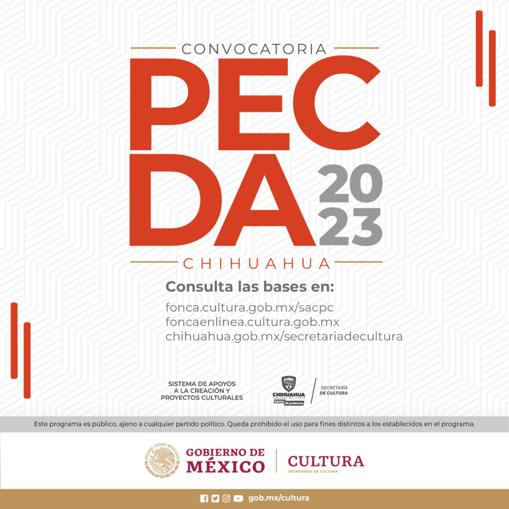 CHIHUAHUA, CHIH.- La Secretaría de Cultura del Gobierno de México, a través del Sistema de Apoyos a la Creación y Proyectos Culturales (SACPC), y el Gobierno de Chihuahua, a través de la Secretaría de Cultura, convocan a artistas, intérpretes, creadoras y creadores, a participar en la convocatoria del Programa de Estímulos a la Creación y Desarrollo Artístico (PECDA) en su edición 2023.